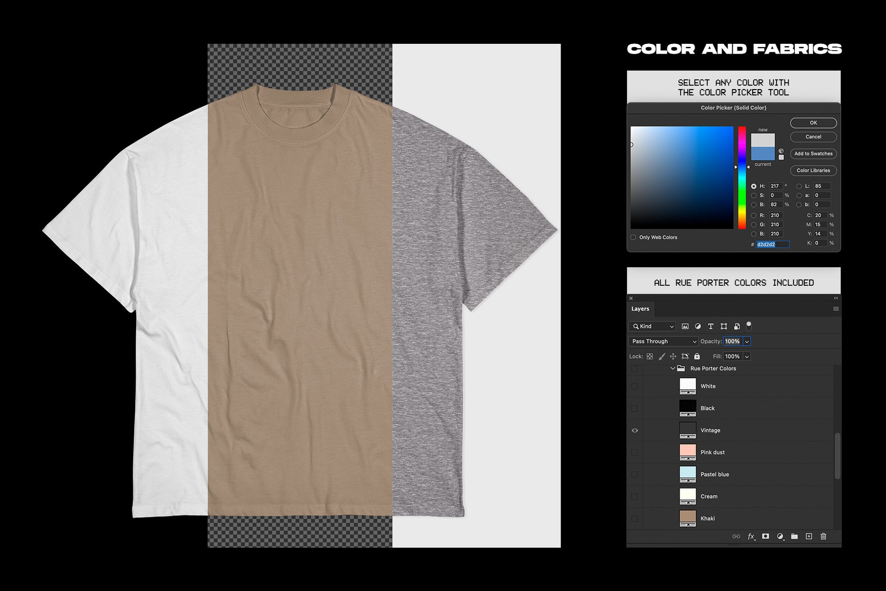 • Straight from the Real World: We’re all about keeping it real, which is why we used actual photos of the Rue Porter RP 1.0 Tee for this mockup. Photographed in a neat, flat-lay, it’s the real deal for showcasing your designs in the most genuine way possible.