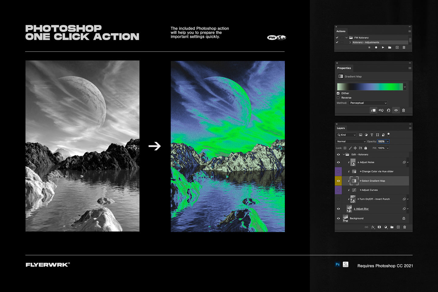 Koloranz is a collection of 120 colorful gradient maps designed for Photoshop. The included Photoshop action will help you to prepare the important settings quickly. You can use them in abstract art, posters designs, album covers or for social media marketing to engage your audience with eye-catching and vivid colors.