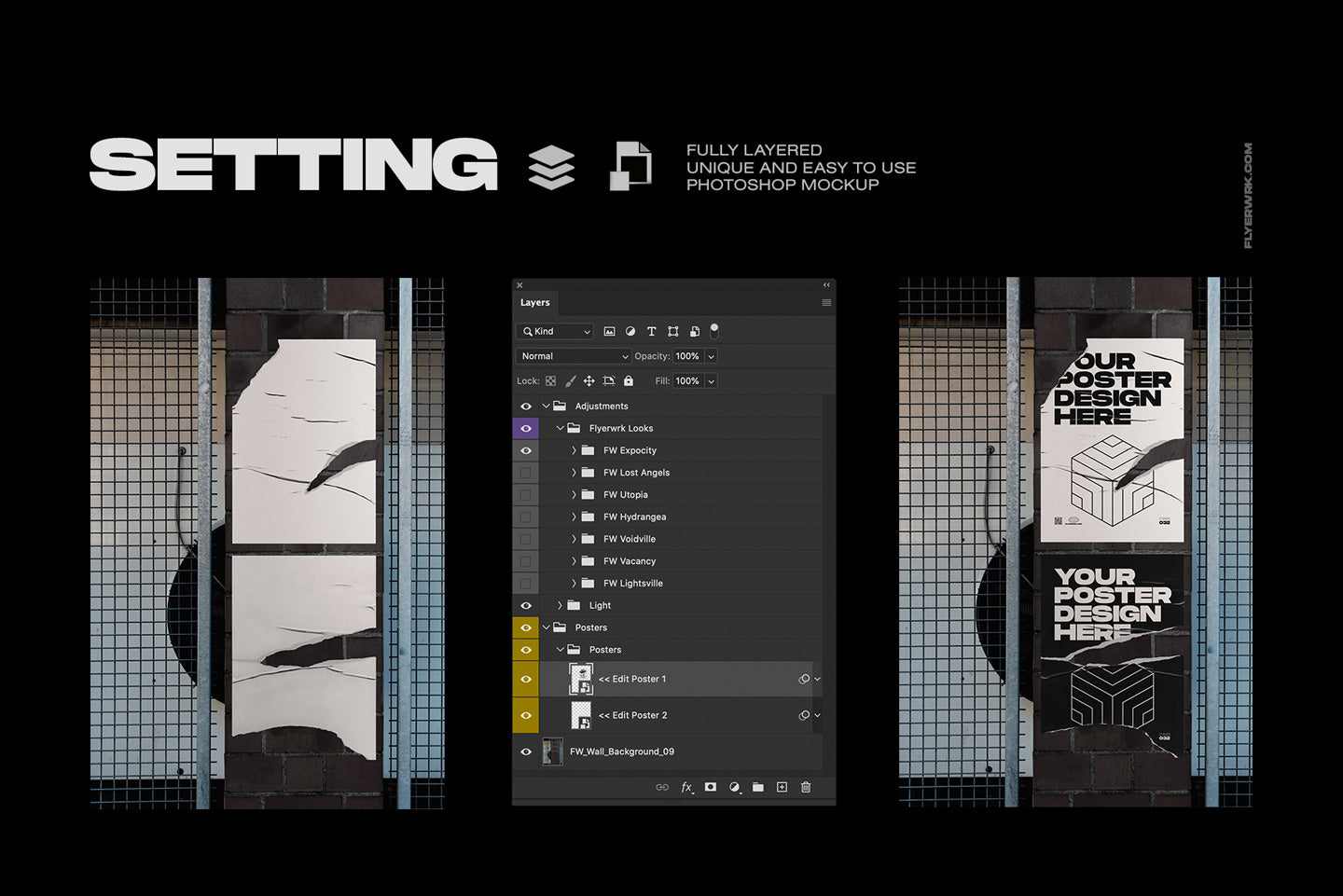 Take a look at our urban poster wall mock-ups today, and you can find it so easy to start making a smart choice with regards to poster development. Each mock-up has been designed to have layers that can be adjusted, moved and removed to suit your own personal preference. We’ve also included separate shadows and reflections, meaning that each of the glued posters that are provide will have a change to how they look.